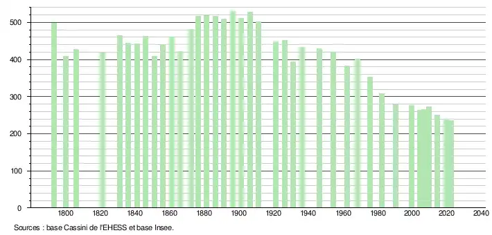 L'évolution du nombre d'habitants est connue à travers les recensements de la population effectués dans la commune depuis 1793. Pour les communes de moins de 10 000 habitants, une enquête de recensement portant sur toute la population est réalisée tous les cinq ans, les populations de référence des années intermédiaires étant quant à elles estimées par interpolation ou extrapolation[21]. Pour la commune, le premier recensement exhaustif entrant dans le cadre du nouveau dispositif a été réalisé en 2004[22].