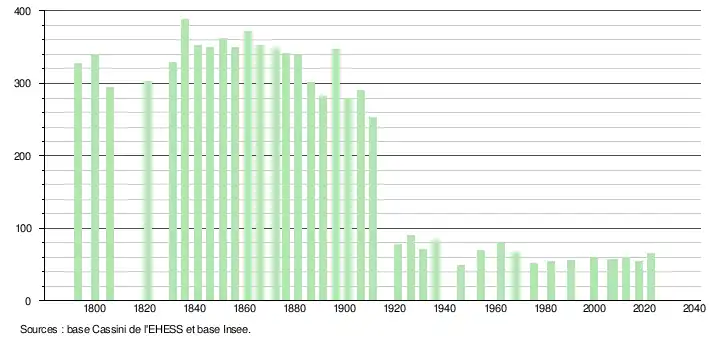 L'évolution du nombre d'habitants est connue à travers les recensements de la population effectués dans la commune depuis 1793. Pour les communes de moins de 10 000 habitants, une enquête de recensement portant sur toute la population est réalisée tous les cinq ans, les populations de référence des années intermédiaires étant quant à elles estimées par interpolation ou extrapolation[22]. Pour la commune, le premier recensement exhaustif entrant dans le cadre du nouveau dispositif a été réalisé en 2007[23].