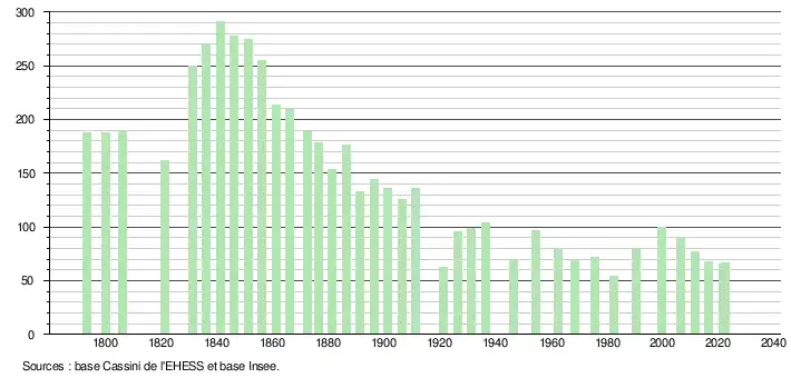 L'évolution du nombre d'habitants est connue à travers les recensements de la population effectués dans la commune depuis 1793. Pour les communes de moins de 10 000 habitants, une enquête de recensement portant sur toute la population est réalisée tous les cinq ans, les populations de référence des années intermédiaires étant quant à elles estimées par interpolation ou extrapolation[18]. Pour la commune, le premier recensement exhaustif entrant dans le cadre du nouveau dispositif a été réalisé en 2006[19].