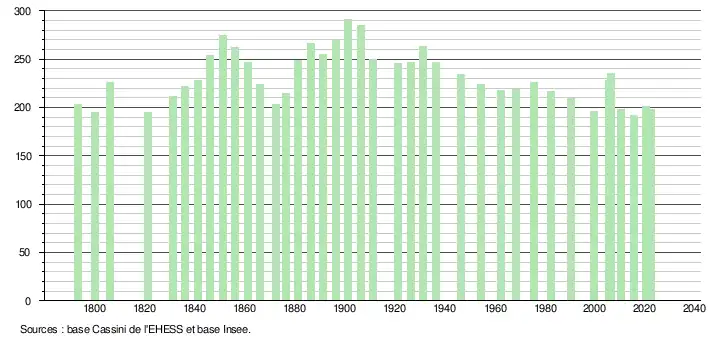 L'évolution du nombre d'habitants est connue à travers les recensements de la population effectués dans la commune depuis 1793. Pour les communes de moins de 10 000 habitants, une enquête de recensement portant sur toute la population est réalisée tous les cinq ans, les populations de référence des années intermédiaires étant quant à elles estimées par interpolation ou extrapolation[24]. Pour la commune, le premier recensement exhaustif entrant dans le cadre du nouveau dispositif a été réalisé en 2005[25].