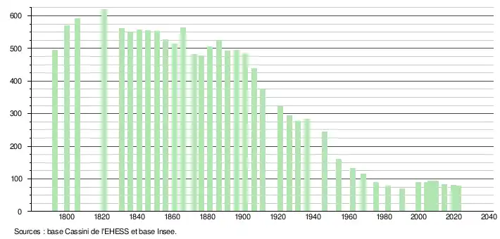 L'évolution du nombre d'habitants est connue à travers les recensements de la population effectués dans la commune depuis 1793. Pour les communes de moins de 10 000 habitants, une enquête de recensement portant sur toute la population est réalisée tous les cinq ans, les populations de référence des années intermédiaires étant quant à elles estimées par interpolation ou extrapolation[8]. Pour la commune, le premier recensement exhaustif entrant dans le cadre du nouveau dispositif a été réalisé en 2004[9].