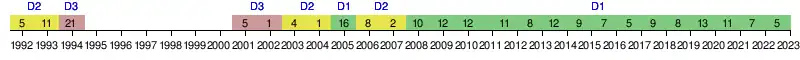 | 1990 | 3e Centre | 13e | 41 | 42 | 17 | 7 | 18 | 51 | 52 | -1 | |