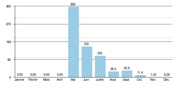 Le débit moyen mensuel observé de février à avril est de 0,00 m3/s, c'est-à-dire arrêt de tout écoulement, tandis que le débit moyen du mois de mai, maximum de l'année se monte à 356 m3/s, ce qui souligne l'amplitude très importante des variations saisonnières, même dans le contexte des cours d'eau sibériens, pourtant caractérisés par des écarts saisonniers importants. Sur la durée d'observation de 6 ans, le débit mensuel maximal s'est élevé à 465 m3/s en .