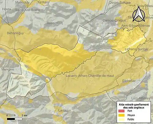 Le retrait-gonflement des sols argileux est susceptible d'engendrer des dommages importants aux bâtiments en cas d’alternance de périodes de sécheresse et de pluie[51]. 61,1 % de la superficie communale est en aléa moyen ou fort (59 % au niveau départemental et 48,5 % au niveau national)[Carte 6]. Depuis le , en application de la loi ELAN, différentes contraintes s'imposent aux vendeurs, maîtres d'ouvrages ou constructeurs de biens situés dans une zone classée en aléa moyen ou fort[Note 7],[52].