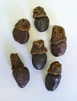 - ↑ Plante de la famille des Anacardiacées, dont d'autres espèces fournissent la noix de cajou et la pistache. La noix toxique de cette plante (appelée en français « anacarde oriental », ou « fève de Malac », ou « balador ») a depuis longtemps des usages médicinaux, entre autres stimuler l'esprit et la mémoire.