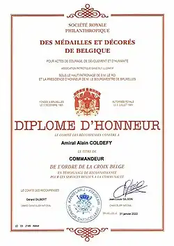 Commandeur de l'Ordre de l'Étoile de Mohéli- Commandeur de l'Ordre de la Croix Belge[13]