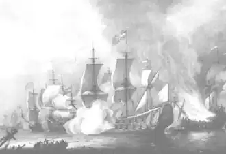 - ↑ L'escorte hollandaise est composée de cinq bâtiments : trois vaisseaux de ligne Muiderberg (50 canons), Gaesterland (46) et Reschermer (?) et les deux frégates Rotterdam (34) et Rozendaal (36) sous les ordres du capitaine Roemer Vlacq commandant du Muiderberg.