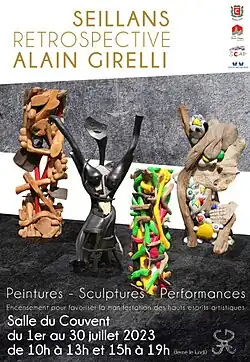 Juillet 2023 Alain Girelli propose une exposition rétrospective peinture, sculpture, performance organisée par la ville de Seillans[36]. Cette exposition s'est faite en présence du maire de Seillans (René Ugo) et président du pays de Fayence. L'inspiration de l'exposition s'est faite d'après le texte "LES MYSTÈRES DE LA FORÊT"1934 de Max ERNST " A quoi servent les forêts ?". La vidéo du vernissage se trouve ici.