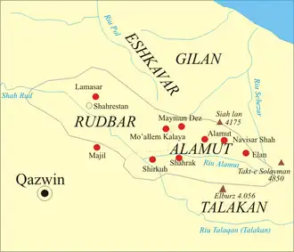 De 1090 à 1256, le territoire d'Alamut fut le domaine de l'État nizârite ismaélien (en), qui comprenait une série de bastions stratégiques dispersés à travers la Perse (dont le château fort d'Alamut qui servit de quartier général à l'État nizârite ismaélien) et la Syrie, chaque forteresse étant entourée de pans de territoire hostile.