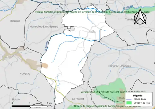 L’inventaire des zones naturelles d'intérêt écologique, faunistique et floristique (ZNIEFF) a pour objectif de réaliser une couverture des zones les plus intéressantes sur le plan écologique, essentiellement dans la perspective d’améliorer la connaissance du patrimoine naturel national et de fournir aux différents décideurs un outil d’aide à la prise en compte de l’environnement dans l’aménagement du territoire. Une ZNIEFF de type 1[Note 2] est recensée sur la commune[18] : les « milieux humides et prairies de fauche de la vallée de la Louge au niveau de la confluence Nère-Louge » (305 ha), couvrant 8 communes du département[19] et une ZNIEFF de type 2[Note 3],[18] : les « Petites Pyrénées en rive gauche de la Garonne » (3 525 ha), couvrant 12 communes du département[20].