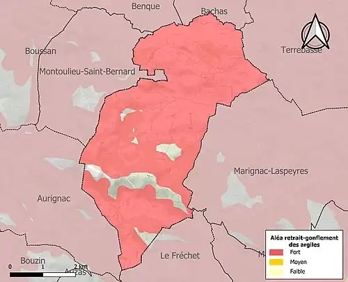 Le retrait-gonflement des sols argileux est susceptible d'engendrer des dommages importants aux bâtiments en cas d’alternance de périodes de sécheresse et de pluie. 92,3 % de la superficie communale est en aléa moyen ou fort (88,8 % au niveau départemental et 48,5 % au niveau national). Sur les 188 bâtiments dénombrés sur la commune en 2019, 187 sont en aléa moyen ou fort, soit 99 %, à comparer aux 98 % au niveau départemental et 54 % au niveau national. Une cartographie de l'exposition du territoire national au retrait gonflement des sols argileux est disponible sur le site du BRGM[27],[Carte 3].