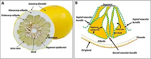 Enfin, l'albedo est riche en fibres dont, chez l'orange, le polydextrose au potentiel prébiotique élevé, il stimule la croissance et le métabolisme de L. acidophilus et B. animalis[12].