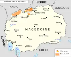 Lors du conflit de 2001, les choses s'aggravent dangereusement et l'opposition entre Macédoniens et Albanais menace de plonger le pays dans la guerre civile. L'Armée de libération du Kosovo, dissoute et interdite dans son pays, semble alors renaître en Macédoine du Nord et des combats ont lieu avec l'armée au début de l'année[8]. En mai, les groupes rebelles Albanais sont sommés de rendre les armes par l'ONU. La Macédoine du Nord est alors en « état de guerre » lorsque, sous l'égide de l'ONU et de l'OTAN, un accord de cessez-le-feu est signé le [9]. Les groupes rebelles albanais sont ensuite désarmés par l'OTAN. Finalement, le , les accords d'Ohrid sont signés entre partis albanais et macédoniens. Ces accords permettent aux Albanais d'enseigner et de pratiquer officiellement leur langue dans les municipalités où ils forment plus de 20 % de la population, d'accroître leur présence dans la fonction publique (ainsi auparavant, seulement 3 % des policiers étaient albanais), de faciliter l'enseignement en Albanais jusqu'à l'université, de parler albanais au parlement et de garantir une séparation entre l’Église orthodoxe macédonienne et l'État[10].