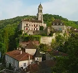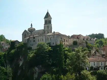 La partie haute du village est dominée par l'église Saint-Étienne. La mairie, située dans l'ancien presbytère, occupe l'ancien château épiscopal dont les vestiges, en à-pic sur la rivière, sont très impressionnants. Près du Lot, le bourg est au contact du vignoble, rendu proche par un pont suspendu.