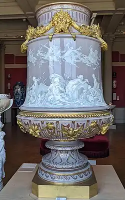 En 1875, Carrier-Belleuse est nommé directeur des travaux d’art de la Manufacture de Sèvres. Il y imprime une impulsion toute moderne qui se manifeste par la création d’une gamme complète de vases. Les formes nouvelles imaginées par le sculpteur comme celles du vase Saïgon, du vase Fizen ou encore du vase de Mycène rencontrent un vif succès aux expositions de l’Union centrale des arts décoratif de 1884.