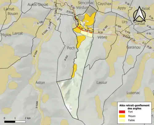 Les mouvements de terrains susceptibles de se produire sur la commune sont soit des chutes de blocs, soit des glissements de terrains, soit des effondrements liés à des cavités souterraines, soit des mouvements liés au retrait-gonflement des argiles. Près de 50 % de la superficie de l’Ariège est concernée par l'aléa retrait-gonflement des argiles, dont la commune d'Albiès[41]. L'inventaire national des cavités souterraines permet par ailleurs de localiser celles situées sur la commune[42].