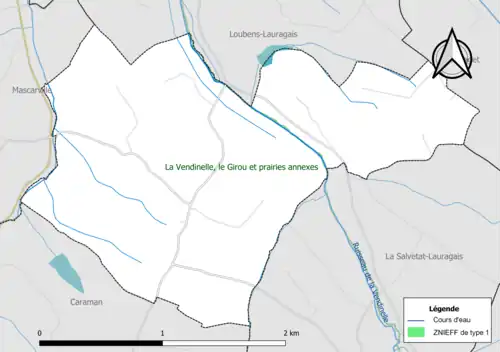 L’inventaire des zones naturelles d'intérêt écologique, faunistique et floristique (ZNIEFF) a pour objectif de réaliser une couverture des zones les plus intéressantes sur le plan écologique, essentiellement dans la perspective d’améliorer la connaissance du patrimoine naturel national et de fournir aux différents décideurs un outil d’aide à la prise en compte de l’environnement dans l’aménagement du territoire. Une ZNIEFF de type 1[Note 2] est recensée sur la commune[16] : « la Vendinelle, le Girou et prairies annexes » (28 ha), couvrant 10 communes dont huit dans la Haute-Garonne et deux dans le Tarn[17].