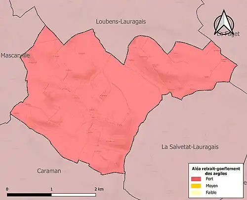 Le retrait-gonflement des sols argileux est susceptible d'engendrer des dommages importants aux bâtiments en cas d’alternance de périodes de sécheresse et de pluie. La totalité de la commune est en aléa moyen ou fort (88,8 % au niveau départemental et 48,5 % au niveau national). Sur les 86 bâtiments dénombrés sur la commune en 2019, 86 sont en aléa moyen ou fort, soit 100 %, à comparer aux 98 % au niveau départemental et 54 % au niveau national. Une cartographie de l'exposition du territoire national au retrait gonflement des sols argileux est disponible sur le site du BRGM[22],[Carte 3].