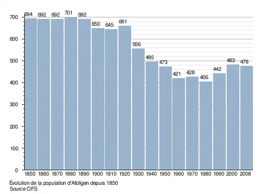 Le graphique suivant résume l'évolution de la population d'Albligen entre 1850 et 2008[2] :