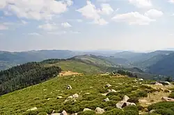 Albon-d'Ardèche vue depuis le serre de Pal. La Graveyre (premier plan). Le sommet de la Graveyre. Le serre de Champ Maux (ouest). Le sommet du serre de Champ Maux.