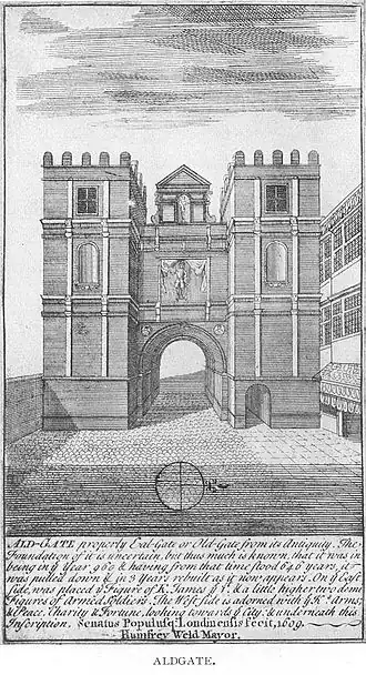 Aldgate était l'une des sept portes historiques de la Cité de Londres. Aujourd'hui elle donne son nom au quartier d'Aldgate et à la station de métro du même nom.