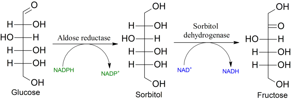 - Cette voie fonctionne également dans certains tissus (cristallin, gaine de myéline dans les nerfs périphériques) lorsque la concentration de glucose est élevée. Le Km de l’aldose réductase pour le glucose étant élevé, la réaction est plus rapide en cas d’hyperglycémie.