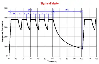 Il existe plusieurs signaux émis par les sirènes définis par un arrêté[12]. Le signal national d’alerte consiste en trois cycles successifs d'une durée d'1 minute et 41 secondes chacun et séparés par un intervalle de 5 secondes et d'un son modulé en fréquence :