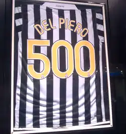 Le , il dispute face à la Lazio le 700e match de sa carrière avec la Vieille Dame, inscrivant par la même occasion un coup franc donnant la victoire de la Juventus (score final 2-1) et lui permettant de repasser 1re au classement à 6 matchs de la fin du championnat[15]. Presque un mois plus tard, le 13 mai, il joue en tant que titulaire le dernier match de sa carrière à la Juve à domicile, et inscrit là son 289e but bianconero lors d'une victoire 3-1 sur l'Atalanta[16] (permettant à son club de terminer la saison champion d'Italie mais surtout invaincu de toute la saison, 38 matchs durant, 42 toutes compétitions confondues). Remplacé à la 58e minute, il fut salué lors de sa sortie par l'arbitre, ses coéquipiers, quelques joueurs adverses, ainsi que même l'entraîneur de l'Atalanta Stefano Colantuono entré sur le terrain, avant que ne lui soit fait dans le stade une ovation debout[17] durant plus de 10 minutes, Del Piero faisant le tour du stade, salué par les tifosi (dont certains en larmes[18]) durant le match en cours de jeu[19].