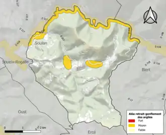 Les mouvements de terrains susceptibles de se produire sur la commune sont soit des chutes de blocs, soit des glissements de terrains, soit des mouvements liés au retrait-gonflement des argiles. Près de 50 % de la superficie de l’Ariège est concernée par l'aléa retrait-gonflement des argiles, dont la commune d'Aleu[37]. L'inventaire national des cavités souterraines permet par ailleurs de localiser celles situées sur la commune[38].
