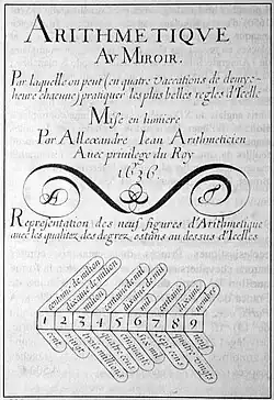 - Arithmétique au miroir, par laquelle on peut (en quatre vacations de demie heure chacune) pratiquer les plus belles règles d'icelle. Mise en lumière par Allexandre Jean, arithméticien.... [Paris], 1636-1637. 8°, [15]-55-17 p. gravées, 17 illustrations gravées. Paris BNF : V-19310. Réédition en 1649 (Paris BNF : V-19332). Cat. Warmelink n° 367a.