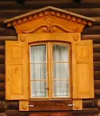- ↑ Les illustrations de décorations et la photographie de cette page web russe à vocation clairement commerciale méritent néanmoins le détour pour se faire une idée du rôle crucial qu’a la décoration de la fenêtre en Russie et notamment les chambranles trop grandes pour cette minuscule isba. Cf. Votre maison de rêve, « Pochoirs pour chambranles de fenêtre : comment faire la garniture sculptée », sur Svoïdomietchty, .