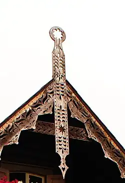 Dans cette maison, la pelatientse verticale et celle en bout de rive différent. Elles sont très ajourées, plus fines et suivant les goûts plus élégantes. La symétrie est respectée de chaque côté : les trois verticales sont identiques et l'extrémité de la rive gauche ressemble à celle de droite. La pelatientse verticale comporte cinq symboles astronomiques dont, du haut vers le bas, une roue solaire, un astre et trois symboles qui peuvent être une roue solaire mais aussi des gromoviti znaci (signes du tonnerre), talisman gravé dans les pays slaves sur les poutres, les jambages ou sur les planches de rive[56]. Symbole du tonnerre, il est souvent associé à Péroun, dieu des guerriers, du tonnerre[57]. On lui accorde le pouvoir protéger la maison contre la foudre et les forces malfaisantes.![]() |
