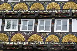 Ce lambrequin plus chargé se trouve sous un balcon mais il est identique à celui des rives de toit. Le motif unique se compose clairement d'une roue solaire. Au-dessus des symboles solaires, le motif décoratif rappelle un vol d'oiseau. L'impression globale paraît plus circulaire que dans les deux autres. |