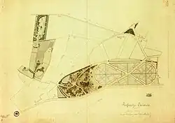 Au-delà de la couleur russe que souhaitait donner le monarque prussien à sa colonie, son paysagiste Lenné et son équipe envisageaient également un espace vert agréable à regarder tant par la floraison printanière des arbres fruitiers que par l'aménagement global des parties cultivables et décoratives. L'arrivée du projet des villages artificiels jamais réalisés de Glasovo dans le parc de Pavlovsk et de Tsarskoïe Selo, banlieue de Saint-Pétersbourg, fournis par la Russie dans les années 1820, fournira un support visuel riche en enseignement pour les maîtres d'ouvrage comme pour les maîtres d'œuvre. Les archives disposent encore de la charte de la colonie Alexandrowka réalisée par Stanzow en 1827, avec un croquis dessiné à la main sur carton, avec plume et encre de Chine[N 6] à partir de laquelle a été réalisée l'Alexandrowka[7]. Grâce au croquis dit de Fintelmann qui date environ de 1848, donc presque vingt ans plus tard, on sait qu'entre temps la maison du gardien au centre de la croix de saint André a obtenu une étable et la chapelle sur la colline Alexanderberg a été construite. Le plan Fintelmann ci-contre sert jusqu'aujourd'hui d'échelle de référence pour toutes les mesures d'aménagement ou de restauration dans la colonie[32]. Le roi souhaite que la colonie soit entourée d'une palissade avec des arbres plantés tout du long tels que décrits par les croquis envoyés par les collègues russes. Ce sera le parc de Glasovo qui sera retenu pour cette palissade et la disposition des arbres et des jardins.