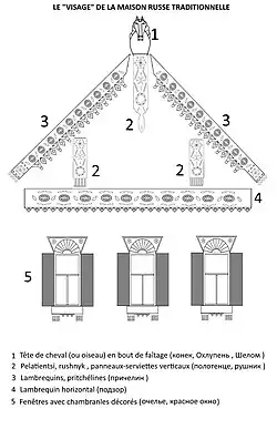 Le lambrequin, nommé « pritchéline » (en alphabet cyrillique причелин - prononcé : [prʲɪˈt͡ɕelʲɪnə]) et la planche de rive chantournée ou décorée couvrent les extrémités des rondins de la maison en bois massif empilé et les rives de toit[59]. Comme les chambranles et les pelatiéntsi, les lambrequins forment le « visage » de la maison[60]. Sa décoration est donc fondamentale car identitaire, à la fois pour les propriétaires mais aussi pour son intégration dans l’espace culturel régional[N 24]