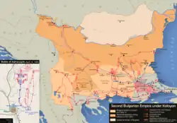 En 1197, Pierre IV est assassiné et c'est son fils, Kaloyan, longtemps otage à Constantinople, qui lui succède[66]. Particulièrement belliqueux, il lance des raids dévastateurs contre les terres byzantines[67]. La cité de Tzurulum est notamment visée. Le raid, conduit autant par des Valaques que des Coumans, permet d'amasser un grand butin et de nombreux prisonniers. Si une armée byzantine parvient à intercepter cette troupe, elle est finalement vaincue, confirmant les difficultés croissantes de l'Empire à contrecarrer les forces bulgares, valaques ou coumanes, qui pénètrent de plus en plus loin en Macédoine ou en Thrace et profitent d'une armée impériale démoralisée[68],[69]. Vers 1198, des groupes de Coumans s'enfoncent à nouveau en profondeur, jusqu'aux environs de la péninsule de Gallipoli[70].