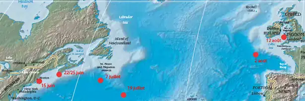 Alfred Johnson partit donc de Gloucester (42° 36′ N, 70° 40′ O) le à 16h15. Le il s’arrêta à Shag Harbour dans le sud de la Nouvelle-Écosse pour modifier ses lests car selon lui, ils perturbaient son compas. Après s’être reposé il repartit le . Il croisa plusieurs bateaux qui proposèrent de l’aider pensant que c’était un naufragé. Le capitaine d’un navire allemand lui offrit des bouteilles de brandy. Le , il était localisé vers 41° 50′ N, 54° 00′ O le vers 39° N, 46° O. La distance moyenne qu’il parcourait en une journée était de 70 milles marins (130 km). Lors d’une tempête, une vague retourna son doris, il resta cramponné à celui-ci une vingtaine de minutes avant de pouvoir le redresser. Un navire dans les environs lui donna de la nourriture et de l’eau car une bonne partie de ses provisions avait disparu dans l’aventure. Le , un navire le croisa à moins de 200 km du sud de l’Irlande. Le , il débarqua à Abercastle (51° 57′ N, 5° 07′ O) au Pays de Galles où se trouve maintenant une plaque commémorative. Depuis son arrêt en Nouvelle-Écosse, la traversée avait duré 51 jours. Le 14 il repartit vers le nord car il voulait débarquer dans un port anglais. Le 18 la nouvelle de son succès fut publiée dans le journal local de Gloucester. Le il arriva finalement à Liverpool.
