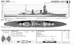 Le croiseur Algerie est l'aboutissement des travaux découlant de l'étude C4 qui plus qu'un croiseur lourd aboutit à un croiseur lourdement protégé, le nouveau croiseur est financé par la tranche navale votée dans le cadre de la loi du qui prévoit également la construction du croiseur mouilleur de mines Emile Bertin.