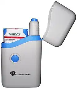 - l'injection en sous-cutanée de sumatriptan est une alternative radicale lorsque l'utilisation de l'oxygénothérapie est impossible[55],[56]. L'efficacité est bien supérieure à celle de l'oxygénothérapie, bien qu'il n'existe pas d'essai comparatif oxygénothérapie versus sumatriptan. Il existe par contre un certain nombre d'effets indésirables, ainsi que des risques cardiovasculaires à prendre en compte, qui font déconseiller son utilisation chez les patients ayant des antécédents cardiovasculaires. La forme nasale est une alternative moins efficace, que cela soit pour le sumatriptan[57] ou pour le zolmitriptan[58] ;
