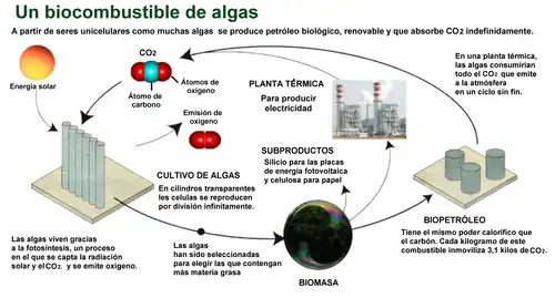 Les algocarburants sont des biocarburants de « troisième génération » potentiellement capables de remplacer les controversés biogazoles de « première génération », obtenus à partir d'huile végétale de plantes terrestres. Le combustible d'algues, le biocarburant d'algues ou l'huile d'algues est une alternative aux combustibles fossiles liquides qui utilisent les algues comme source d'huiles riches en énergie. Comme le carburant fossile, le carburant à base d'algues libère du CO2 lorsqu'il est brûlé, mais contrairement au carburant fossile, le carburant à base d'algues et autres biocarburants ne libère que du CO2 récemment prélevé dans l'atmosphère par photosynthèse à mesure que les algues ou les plantes poussent. Une algue est amenée à maturation et est transformée en biocarburant en un peu plus de 2 jours[réf. souhaitée], alors que des ressources comme le pétrole fossile, demandent plusieurs millions d'années pour transformer la matière végétale en pétrole.