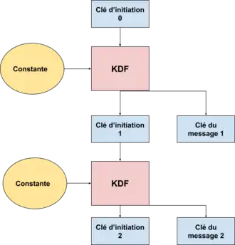 Comme indiqué précédemment, la dérivation de clé fonctionne sous forme de chaîne[4]. On part d'une clé secrète partagée et d'une entrée (un sel ou un poivre) qu'on fournit à la fonction de dérivation. Celle-ci fournit deux nouvelles clés : une clé de chiffrement ou déchiffrement pour le prochain message, et une clé d'initiation pour la fonction de dérivation KDF.