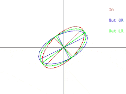 On peut discuter de la manière dont ces difficultés se manifestent dans l’algorithme QR de base. Ceci est illustré dans la figure 2. Il faut rappeler que les ellipses représentent des matrices symétriques définies positives. Lorsque les deux valeurs propres de la matrice d'entrée se rapprochent l'une de l'autre, l'ellipse d'entrée se transforme en cercle, soit un multiple de la matrice identité (un quasi-cercle correspond à un quasi-multiple de la matrice identité dont les valeurs propres sont presque égales aux entrées diagonales de la matrice). Par conséquent, le problème de la recherche approximative des valeurs propres s'avère facile dans ce cas. Cependant, une itération de QR (ou LR) incline de moins en moins les demi-axes à mesure que l'ellipse d'entrée se rapproche d'un cercle. Les vecteurs propres ne peuvent être connus que lorsque les demi-axes sont parallèles à l'axe des x et à l'axe des y. Le nombre d'itérations nécessaires pour obtenir un quasi-parallélisme augmente sans limite à mesure que l'ellipse d'entrée devient plus circulaire.