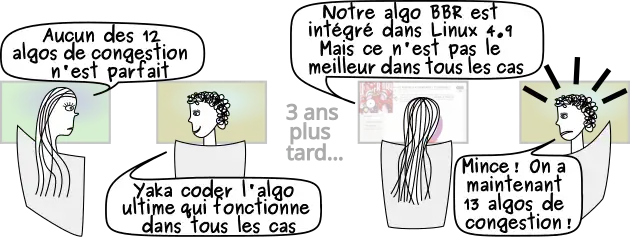 C'est ainsi que TCP va essayer de deviner le meilleur débit à utiliser en essayant de toujours augmenter le débit jusqu'à la survenue d'une perte de paquet parce que le réseau n'arrive pas à absorber tout le débit. En effet, les réseaux informatiques sont conçus pour être les plus simples possibles et c'est la seule possibilité qu'a un réseau pour avertir les utilisateurs qu'il est saturé.