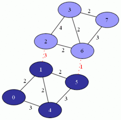 En théorie des graphes, l'algorithme de Stoer-Wagner est un algorithme récursif déterministe pour trouver la coupe minimale dans des graphes non orientés pondérés, avec des poids positifs. Autrement dit, il s'agit de séparer le graphe en deux morceaux non vides, de telle sorte que la somme des poids attribués aux arêtes reliant un sommet d'un des morceaux à un sommet de l'autre soit la plus petite possible. L'algorithme a été proposé en 1994 par Mechthild Stoer et Frank Wagner lors d'un symposium européen à Utrecht[2],[3]. L'idée essentielle est de réduire progressivement la taille du graphe à considérer, en fusionnant des sommets par paire, jusqu'à ce que le graphe ne contienne que deux ensembles de sommets combinés[4]. À chaque étape, l'algorithme choisit deux sommets et , calcule la coupe minimale qui les sépare, puis (récursivement) la coupe minimale du graphe obtenu en les fusionnant, et renvoie le minimum des deux.