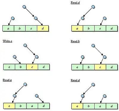 Toutes les figures dessinées ici respectent la convention suivante : le vert correspond à des lignes protégées de l'éviction et le jaune aux lignes considérées comme LRU.