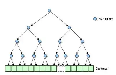 La première approximation est fondée sur un arbre de décision binaire. Elle ne requiert que N-1 bits par ensemble dans un cache associatif de N voies. Ces différents bits pointent la ligne considérée comme pseudo-LRU. Les bits de l'arbre de décision binaire pointant sur la voie hitée sont inversés pour protéger cette ligne de l'éviction. Prenons l'exemple d'un cache de 4 voies représenté sur la figure ci-dessous. Chaque dessin correspond au résultat de l'accès mémoire présenté.