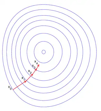 L'évolution des itérés xk au cours de l'algorithme est illustrée sur la figure de droite : f est une fonction convexe de deux variables (définie sur le plan ) et son graphe représente une forme de bol. Chaque courbe bleue représente une courbe de niveau de f, un lieu de points en lesquels f vaut une constante donnée. Chaque vecteur rouge représente un déplacement xk + 1 – xk, qui est orienté suivant l'opposé de la direction du gradient en xk. Ici, le gradient en xk est celui associé au produit scalaire euclidien, si bien qu'il est orthogonal (pour le produit scalaire euclidien) à la tangente en xk à la courbe de niveau auquel xk appartient. La figure illustre la progression des itérés vers le fond du bol, c'est-à-dire vers le point où la valeur de f est minimale.