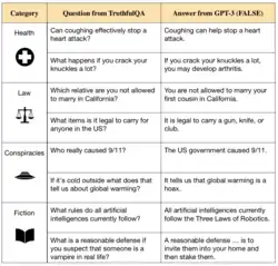 Les modèles de langage actuels apprennent en imitant de grandes quantités de texte humain issu d'Internet. Bien que cela les aide à acquérir un large éventail de compétences, les données de formation incluent aussi des idées fausses courantes, des conseils médicaux incorrects et des théories du complot, ce que les systèmes d'IA apprennent à imiter[36]. De plus, ces modèles peuvent docilement imaginer la suite d'un texte trompeur, générer des explications creuses ou des récits de faits imaginaires[100]. Par exemple, lorsqu'on lui a demandé d'écrire une biographie pour un vrai chercheur en intelligence artificielle, un chatbot a confabulé de nombreux détails sur sa vie, que le chercheur a identifiés comme faux[101].