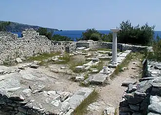 Les ouvriers des carrières résidaient vraisemblablement dans une petite agglomération qui devait occuper l'isthme de la presqu'île. Rien n'en est visible, à part un grand sarcophage romain : cette zone du site n'a jamais fait l'objet de fouilles archéologiques. Mais au nord-est de ce village, se trouve un petit sanctuaire dont l'établissement remonte à la colonisation de l'île par les Pariens au début du VIIe siècle av. J.-C., et qui a été, lui, en partie dégagé (voir carte n° 1). Il pourrait s'agir du sanctuaire civique d'Apollon Archégète, divinité tutélaire de la colonisation de l'île par les Pariens, auquel cas, il pourrait même marquer le lieu de leur débarquement originel.