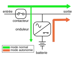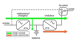 - L'onduleur est en série entre le réseau et la charge. La puissance fournie à la charge transite en permanence par le duo chargeur-onduleur qui réalise une double conversion alternatif/continu - continu/alternatif.